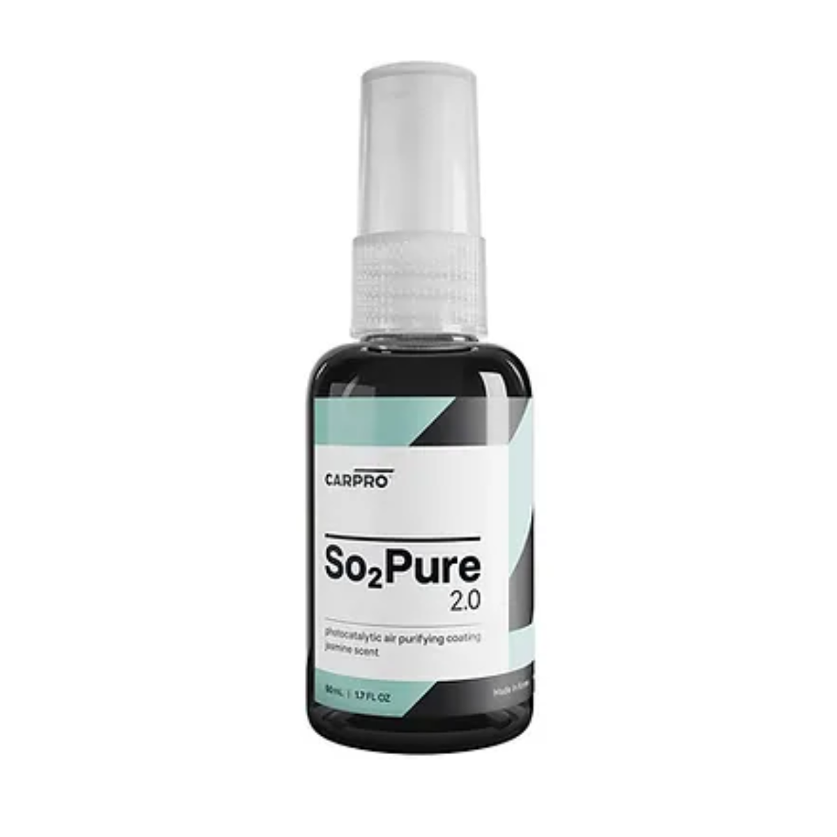 CARPRO So2Pure 2.0 é uma versão atualizada e mais forte do nosso revestimento interior fotocatalítico, que quando exposto à luz, destrói ativamente até os odores e poluentes mais difíceis, deixando para trás apenas ar limpo e fresco com um leve aroma de jasmim.