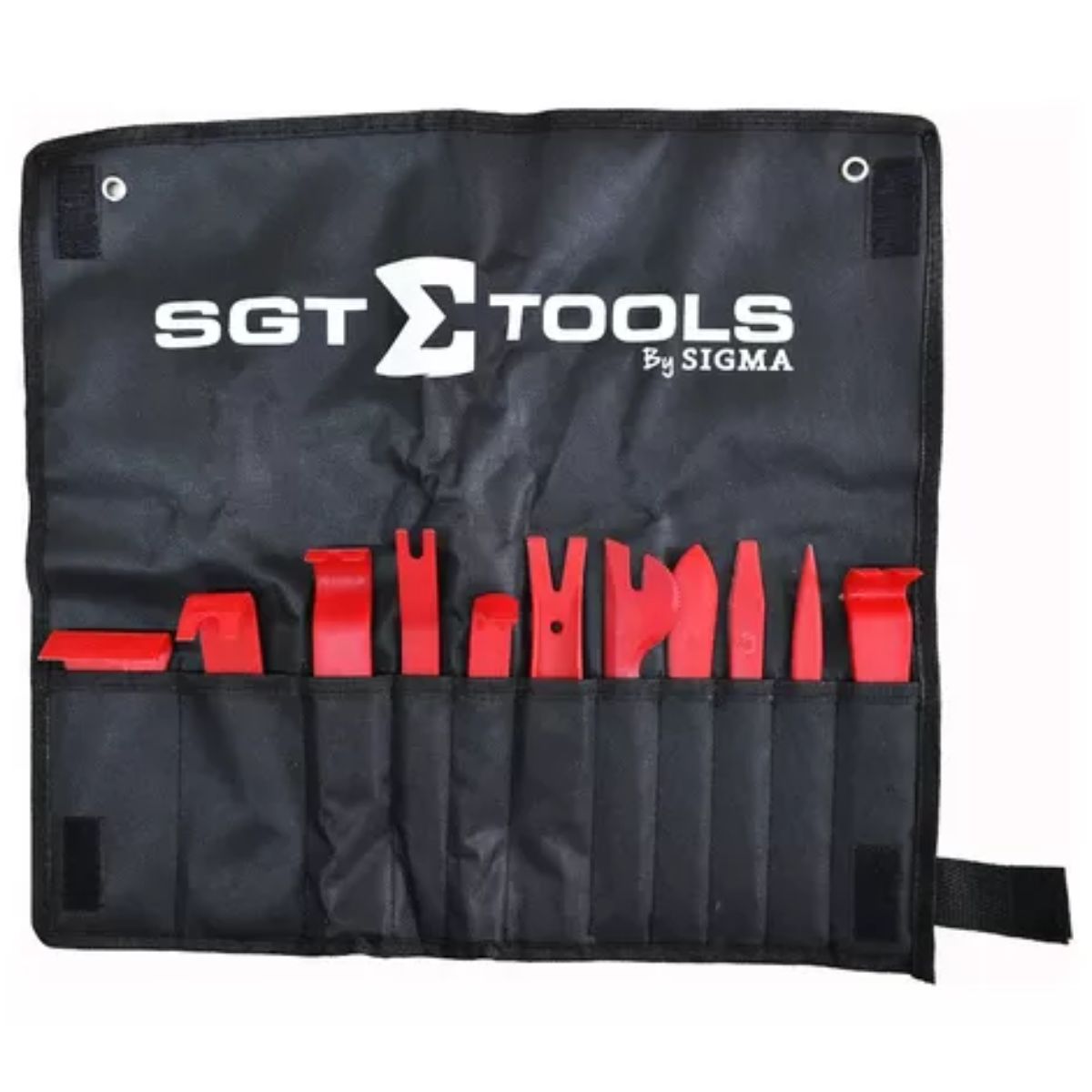 Este conjunto de espátulas automotivas de nylon Sigma é composto por 11 peças, cada uma com um tamanho e formato específico para desempenhar uma função determinada. Inclui: