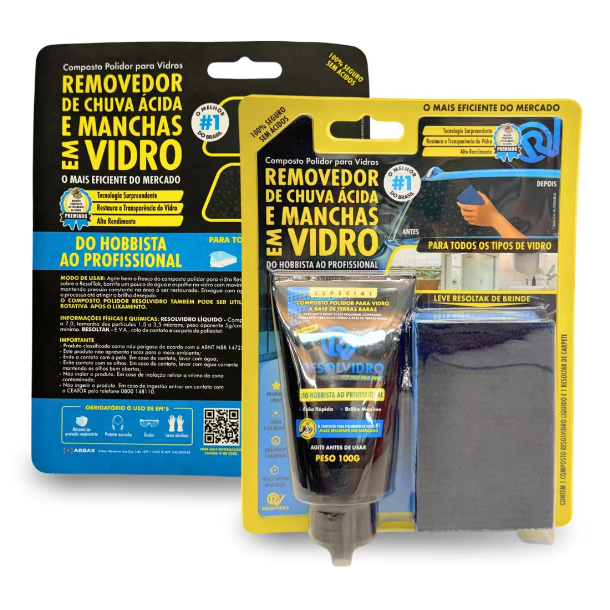 O Kit para Descontaminação e Polimento de Vidros Resolvidro entrega a combinação perfeita para recuperar totalmente a transparência do vidro. Ele remove chuva ácida, manchas pesadas, opacidade e micro-riscos, devolvendo brilho cristalino com resultado profissional.