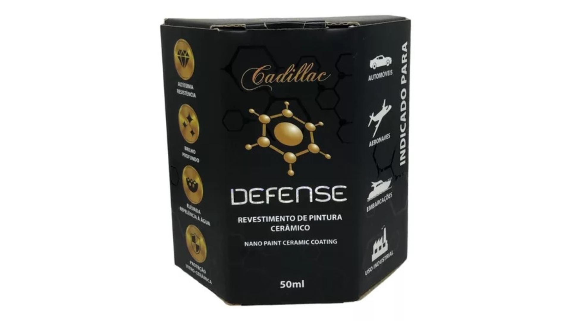Descrição: O revestimento de Pintura DEFENSE CADILLAC® é uma solução inovadora e de alta performance da CADILLAC® para garantir brilho em profundidade e proteção vitro cerâmica de altíssima resistência a automóveis, embarcações, aeronaves e equipamentos industriais. Sua formulação a base de sílica cria uma camada nanométrica de resistência extremamente elevada, que vai aumentar a resistência a microrriscos, excrementos de pássaros, maresia, raios UV e chuva ácida, como você nunca viu!