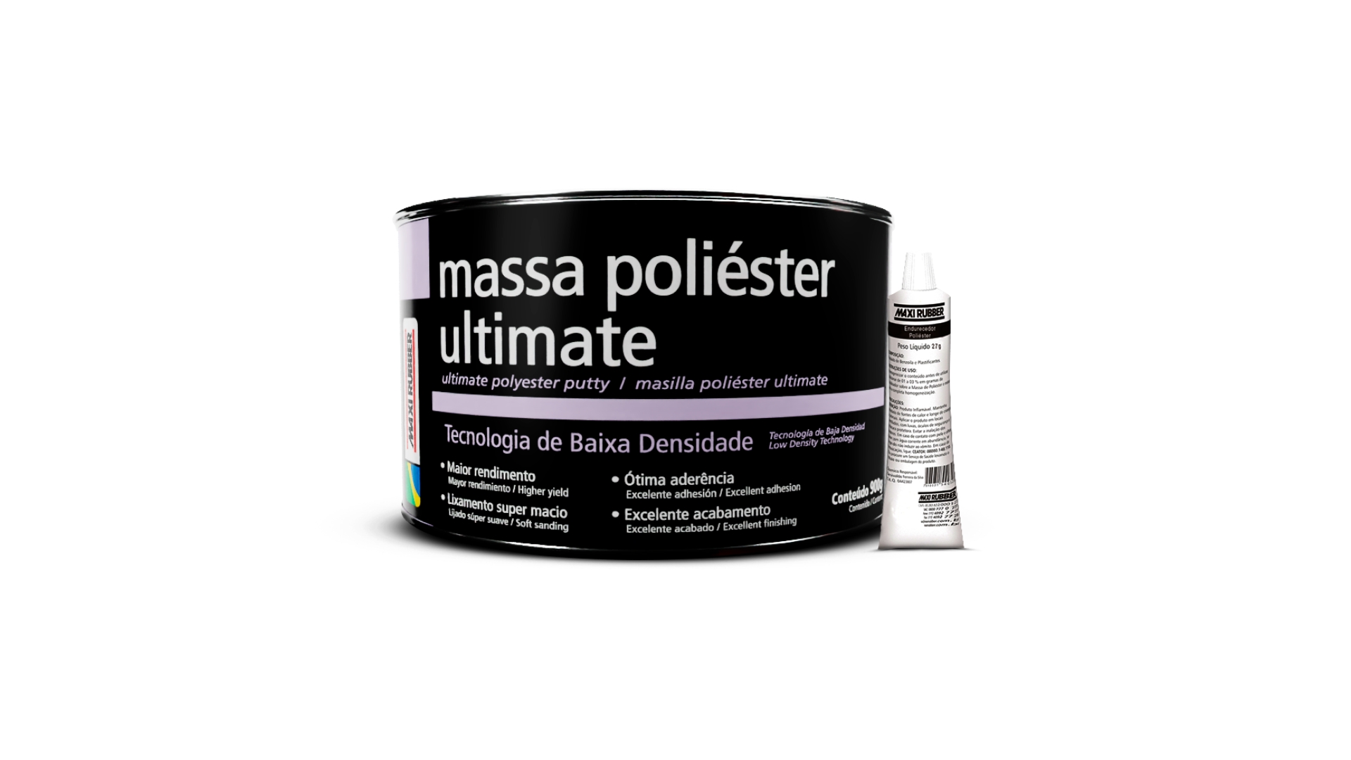 Vantagens: tecnologia Maxi Rubber de baixa densidade, 40% mais volume que a massa poliéster tradicional, aspecto uniforme, ótima aderência, lixamento super macio, maior rendimento e excelente acabamento.