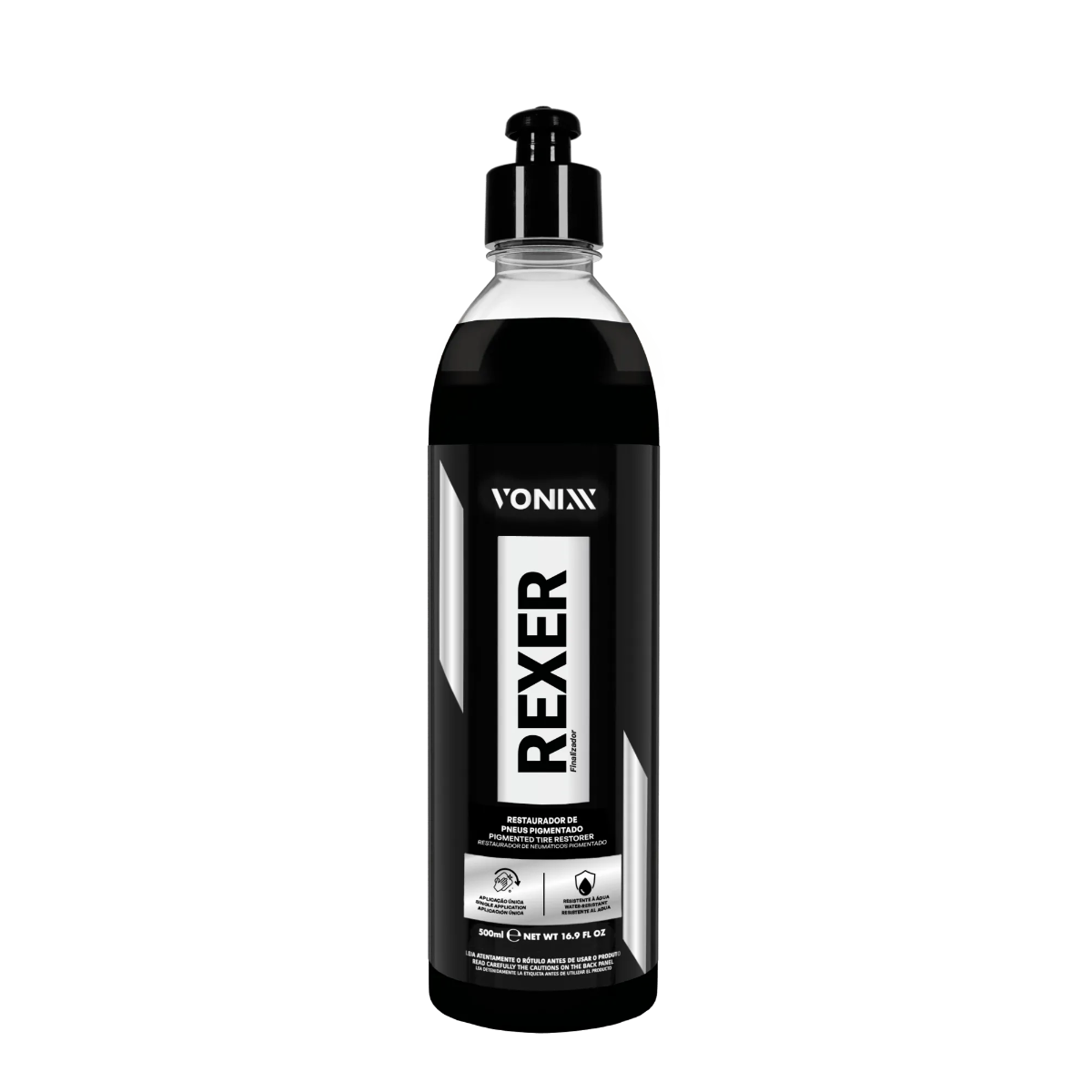 O Rexer é um restaurador de pneus pigmentado desenvolvido pela Vonixx para devolver a aparência original e o preto intenso aos pneus. Sua fórmula cria um filme seco e resistente à água, garantindo brilho duradouro e acabamento profissional.